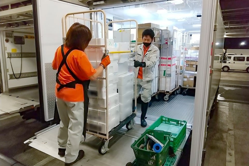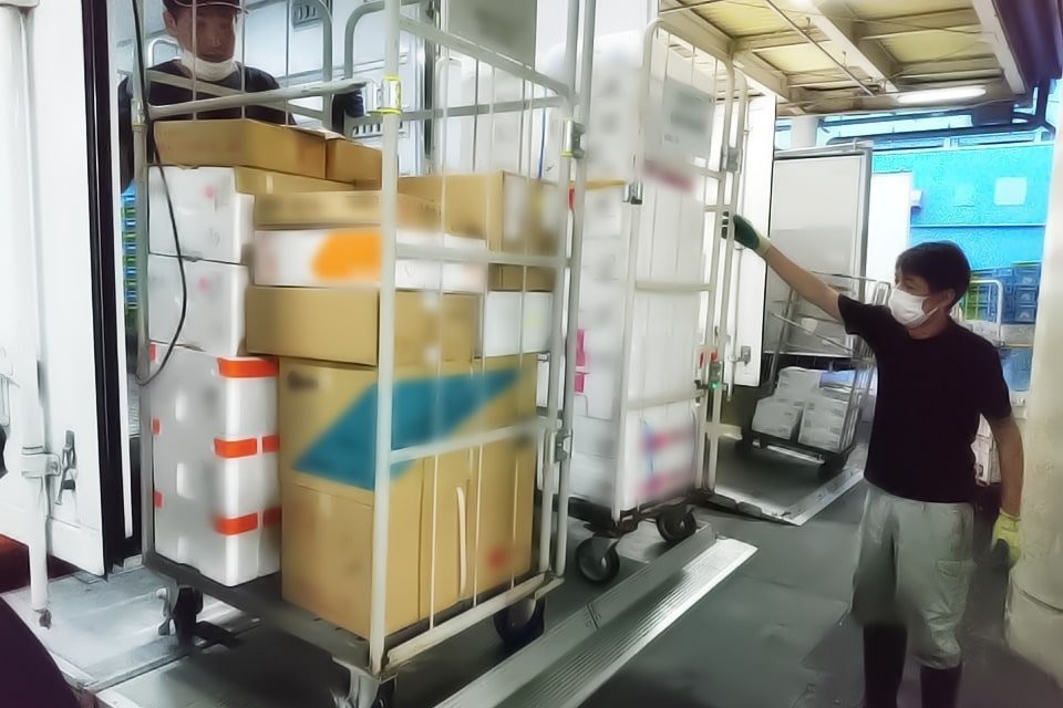 主に水産物・水産加工品(一部青果等)を、豊洲・横浜本場・川崎南部市場~主にスーパー各店舗へ配送して頂きます。