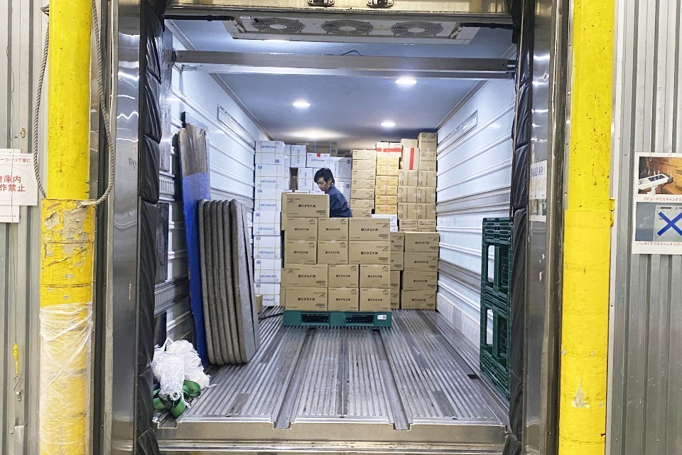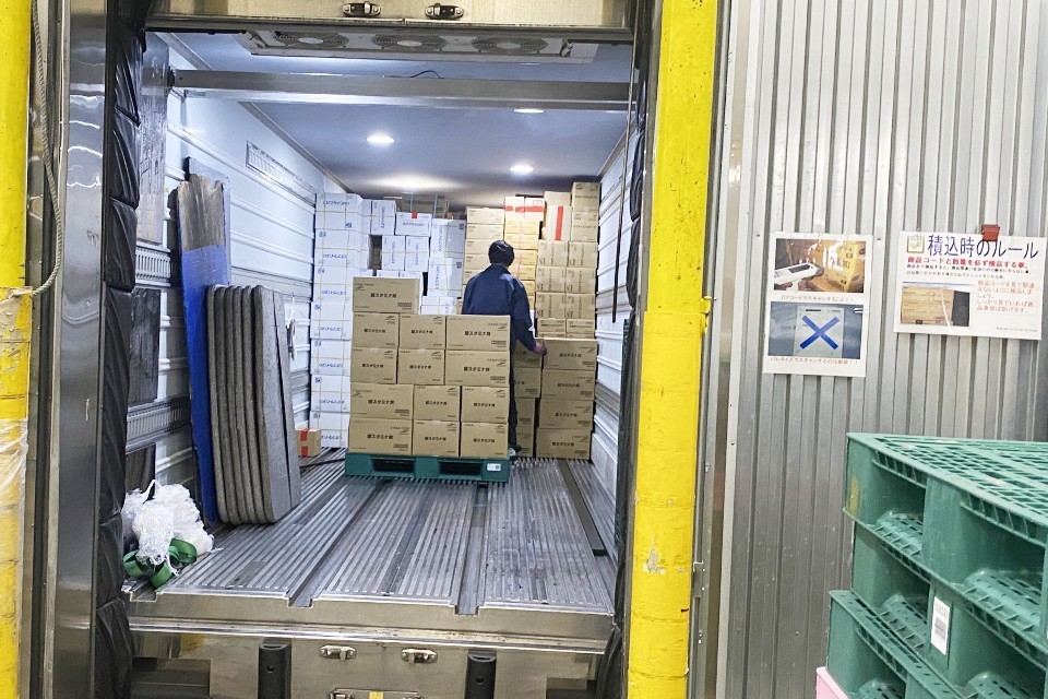 [積み降ろし方法]センター間での輸送がメインで、手積み・手降ろし⇒一部パレットを使用します。