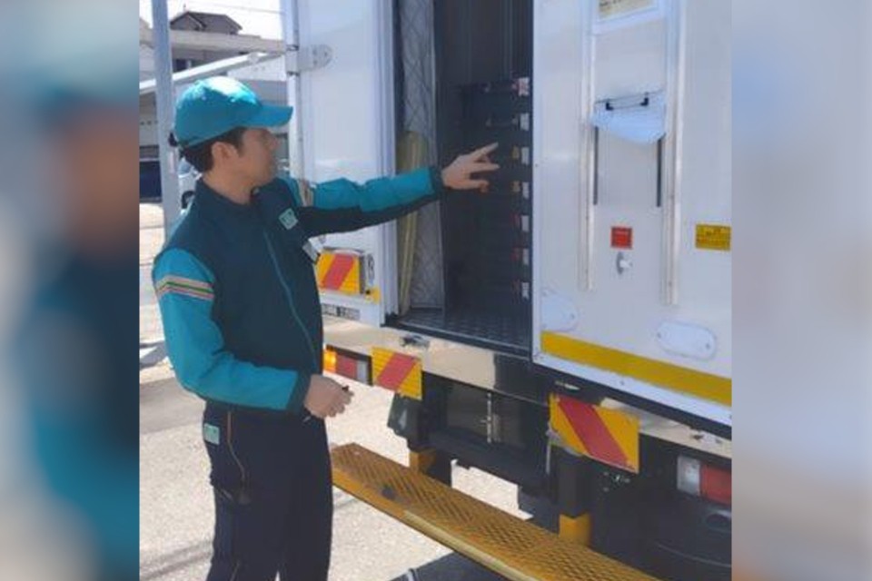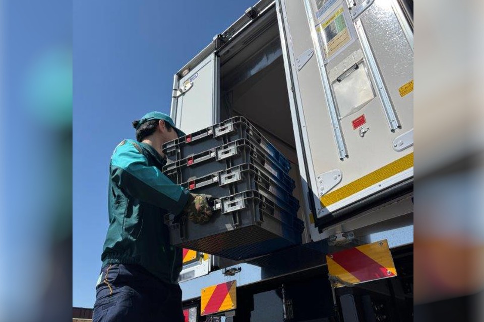冷蔵倉庫で配送先ごとに荷物を仕分けた後にトラックに積み込み、