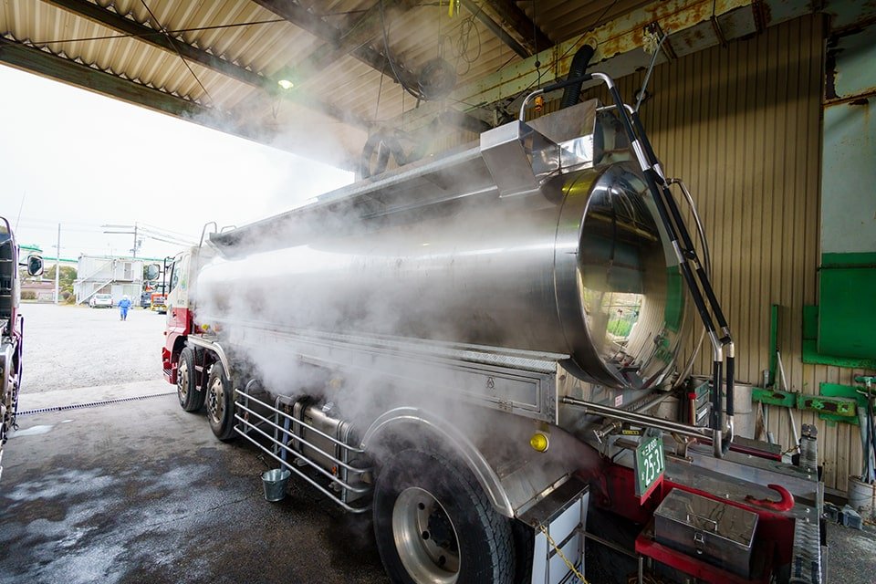 運搬方法としては工場のタンクとホースで繋ぎ、液送します。