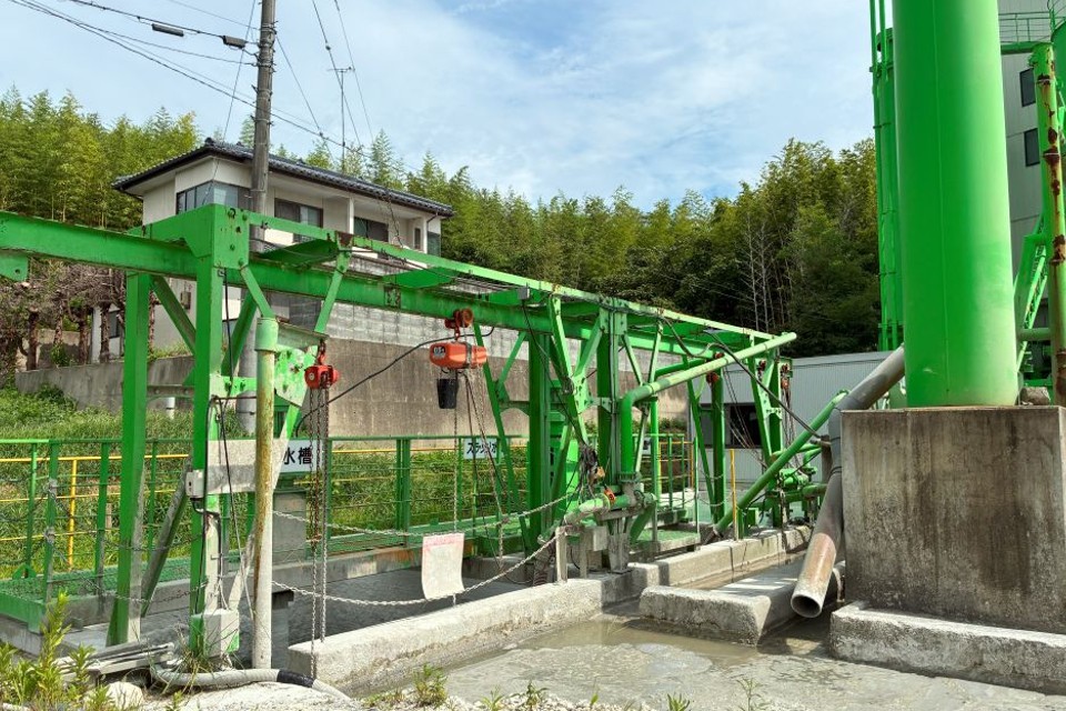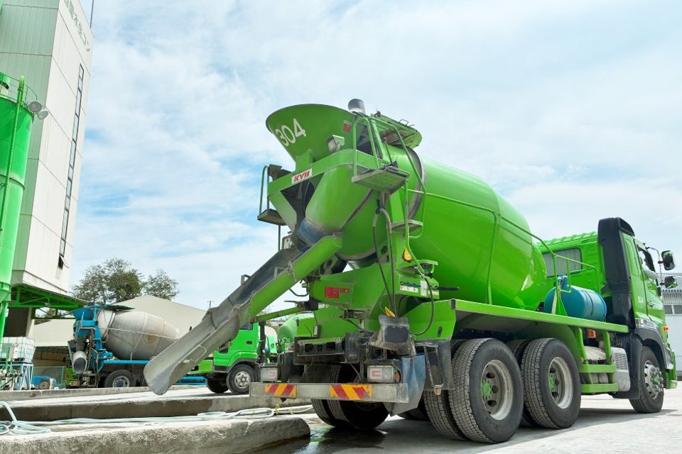 自社工場で生コンをミキサー車へ積み込み、出発準備