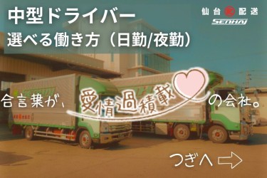 出発前点呼→積込み→配送→帰社エリア:宮城県内8割/岩手・山形・福島2割コース例:4t:県内へ建材・食品・飲料(10件前後/日中)4t:福島へ新聞(3〜6件/夜間)