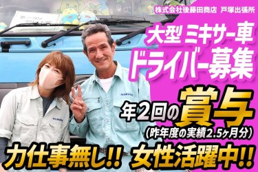 【普免スタートOK】費用は全額会社負担で大型免許へ!女性ドライバーも活躍中★大型ミキサー車のドライバー募集!★選べる勤務地★体への負担少なめ、長距離運転なし!16時定時&日祝休み◎フランクな職場です♪