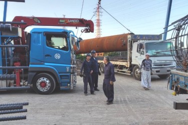 「ユニック」を使用して資材の積み込み、