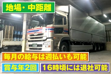 大型トラックによる ○関西方面へ配送業務をおこなっていただきます。 (主にパレット配送です。) ・配送範囲:主に近畿圏内となります。 ◇フォークリフト免許あれば尚良し 免許がない方は、自己負担にて、入社後取得していただきます。 【賃金例】賃金月額は約30万円~40万円になります。 うち、歩合手当は月に約17万円~になります。 ☆大型トラック運転経験者の方優遇します。 ※変更範囲:変更なし