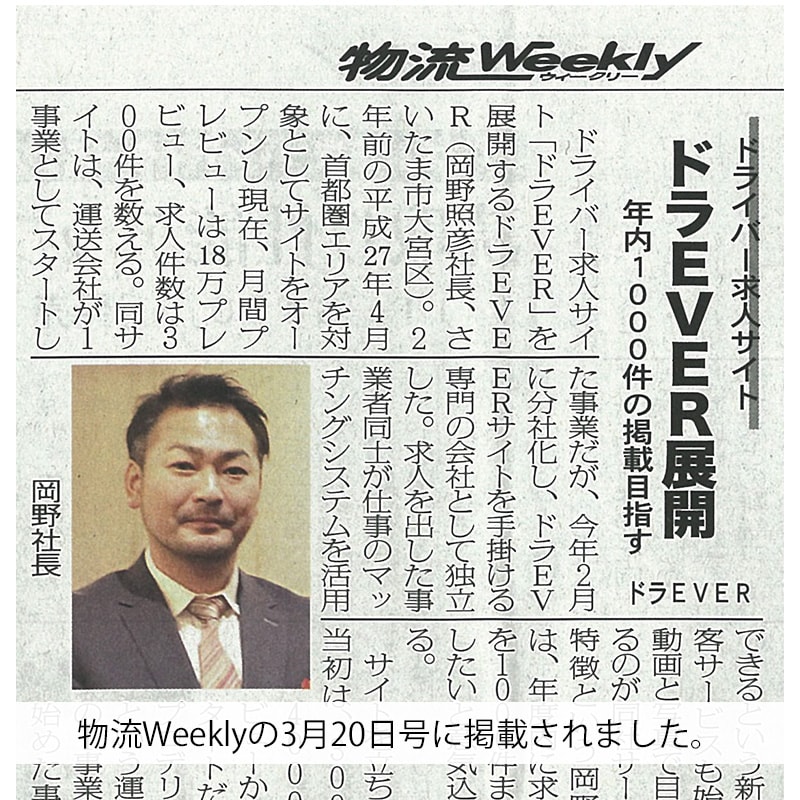 物流WeeklyにドラEVERの今後の展開記事が掲載されました ドラEVER ブログ メディア情報 物流WeeklyにドラEVERの今後の展開記事が掲載されました Tweet 2017年3月20日に発行された物流Weekly No.1530に、求人サイト「ドラEVER」の今後の展開が記事として掲載されました。 投稿ナビゲーション 前の記事へ 次の記事へ