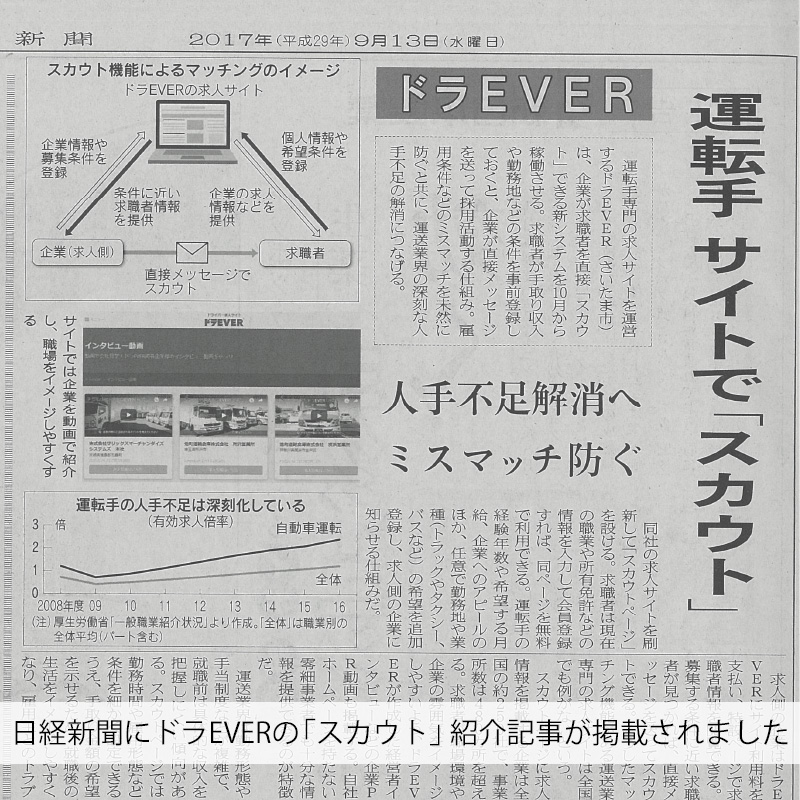 2017年9月17日に発行された日経新聞に、求人サイト「ドラEVER」のスカウト機能紹介記事が掲載されました。 ドラEVER ブログ メディア情報 2017年9月17日に発行された日経新聞に、求人サイト「ドラEVER」のスカウト機能紹介記事が掲載されました。 Tweet 2017年9月17日に発行された日経新聞 第47254号に、求人サイト「ドラEVER」の10月から実装されるスカウト機能に関する紹介記事が掲載されました。 投稿ナビゲーション 前の記事へ 次の記事へ