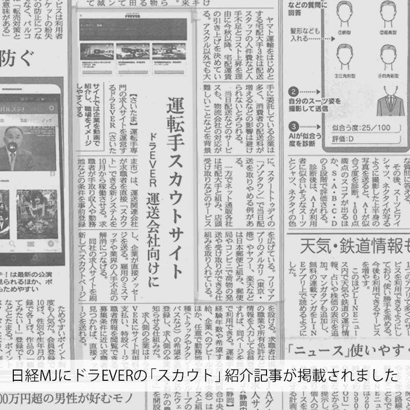 2017年9月20日に発行された日経MJに、求人サイト「ドラEVER」のスカウト機能紹介記事が掲載されました。 ドラEVER ブログ メディア情報 2017年9月20日に発行された日経MJに、求人サイト「ドラEVER」のスカウト機能紹介記事が掲載されました。 Tweet 2017年9月20日に発行された日経MJに、求人サイト「ドラEVER」の10月から実装されるスカウト機能に関する紹介記事が掲載されました。 投稿ナビゲーション 前の記事へ 次の記事へ