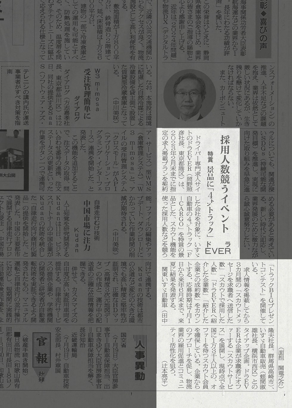 7月22日発行の「物流ニッポン」にドラEVERの記事が掲載されました。 ドラEVER ブログ NEWS 7月22日発行の「物流ニッポン」にドラEVERの記事が掲載されました。 Tweet 7月22日発行の「物流ニッポン」にドラEVERの記事が掲載されました。 ▼イベントの詳細はこちらの特設ページから トラックBIGプレゼントコンテスト 投稿ナビゲーション 前の記事へ 次の記事へ
