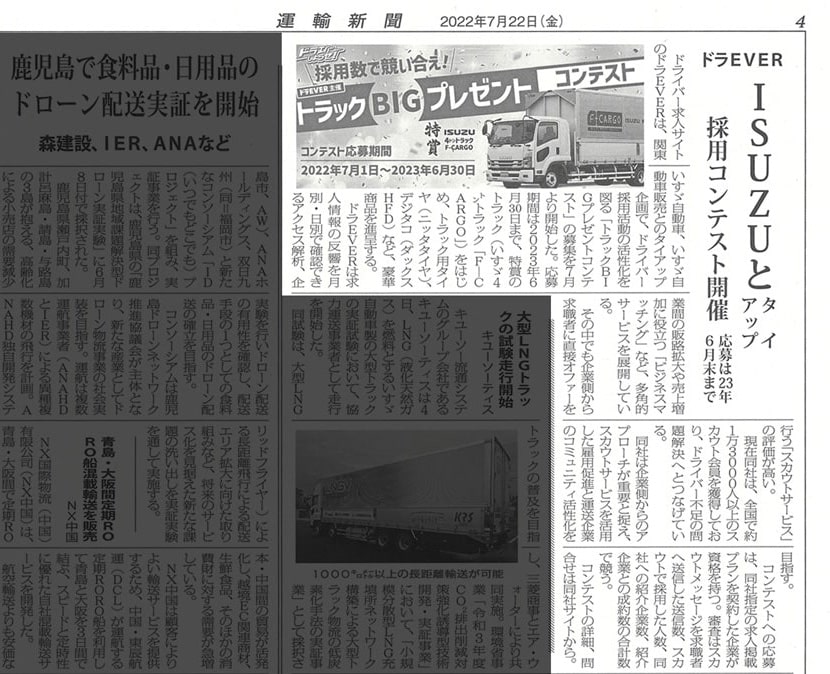7月22日発行の「運輸新聞」にドラEVERの記事が掲載されました。 ドラEVER ブログ NEWS 7月22日発行の「運輸新聞」にドラEVERの記事が掲載されました。 Tweet 7月22日発行の「運輸新聞」にドラEVERの記事が掲載されました。 ▼イベントの詳細はこちらの特設ページから トラックBIGプレゼントコンテスト 投稿ナビゲーション 前の記事へ 次の記事へ