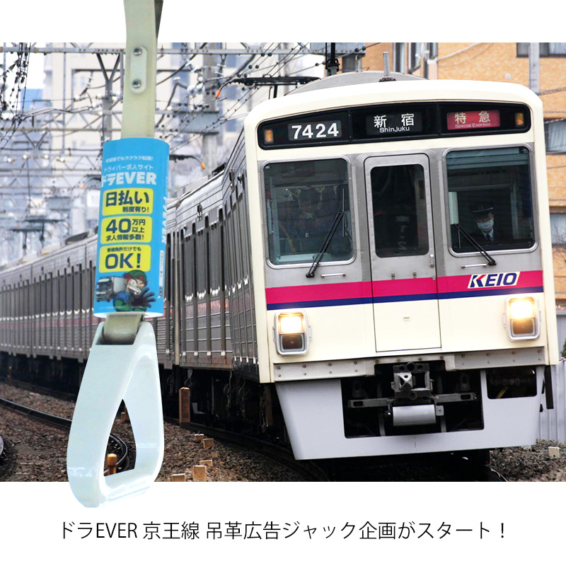 期間中、京王線の新宿~高尾山口 区間と、新宿~橋本 区間(※井の頭線はなし)を走行する電車 6号車の車両全体が、ドラEVERの吊革広告専属車両となります。 (走行する車両の時間帯はランダムとなります。)