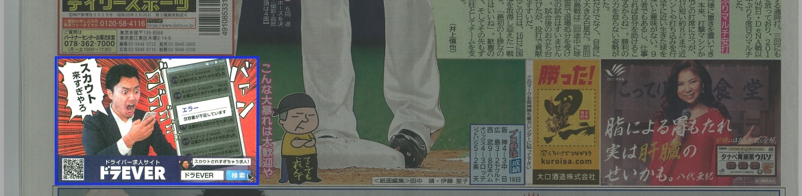 4月19日発行のデイリースポーツ新聞に、求人サイト「ドラEVER」広告が掲載されます ドラEVER ブログ メディア情報 4月19日発行のデイリースポーツ新聞に、求人サイト「ドラEVER」広告が掲載されます Tweet 2018年4月19日発行のデイリースポーツ新聞に、求人サイト「ドラEVER」の広告が掲載されました。 掲載された広告はこちら 投稿ナビゲーション 前の記事へ 次の記事へ