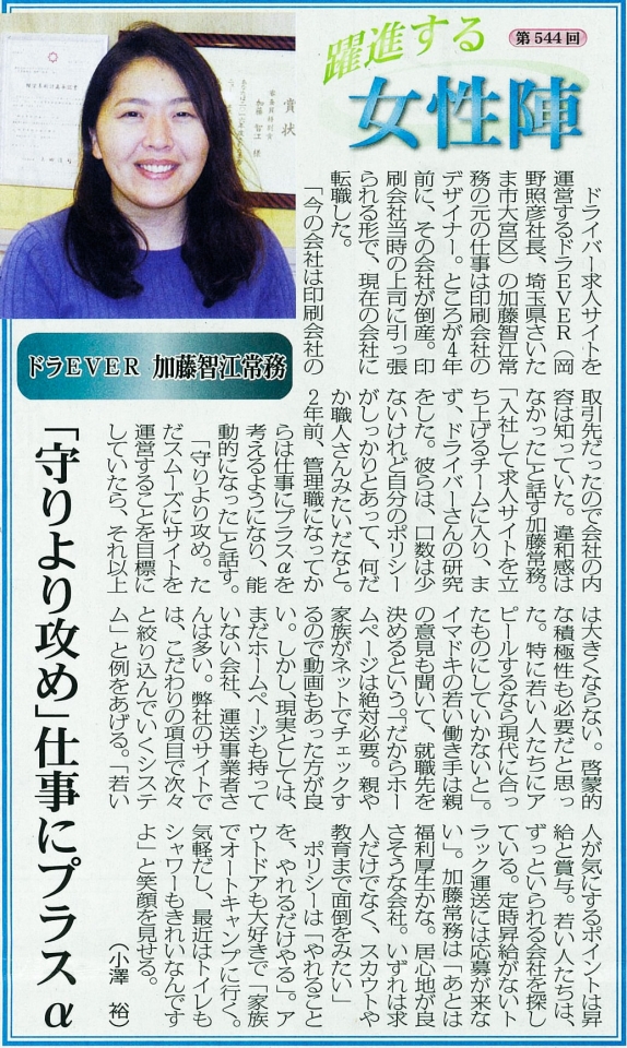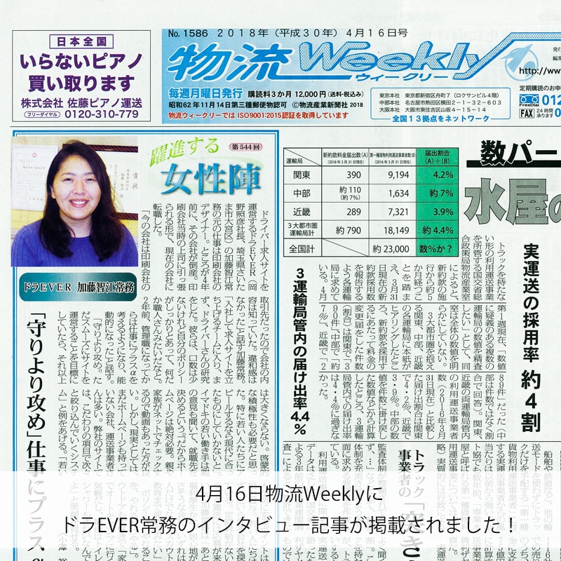 4月16日物流Weeklyに ドラEVER 加藤智江 常務取締役のインタビュー記事が掲載されました! ドラEVER ブログ メディア情報 4月16日物流Weeklyに ドラEVER 加藤智江 常務取締役のインタビュー記事が掲載されました! Tweet 2018年4月16日に発行された物流Weekly の「躍進する女性陣 第544回」にドラEVER 加藤 智江 常務取締役のインタビュー記事が掲載されました。 投稿ナビゲーション 前の記事へ 次の記事へ
