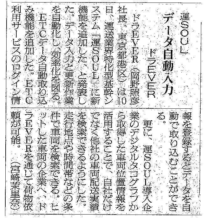 2024年9月20日発行の「物流ニッポン」に運SOUL新規機能追加の記事が掲載されました ドラEVER ブログ NEWS 2024年9月20日発行の「物流ニッポン」に運SOUL新規機能追加の記事が掲載されました Tweet 2024年9月20日発行の「物流ニッポン」にドラEVERの運送業界特化型基幹システム『運SOUL』の新規機能追加について記事が掲載されました。 投稿ナビゲーション 前の記事へ 次の記事へ