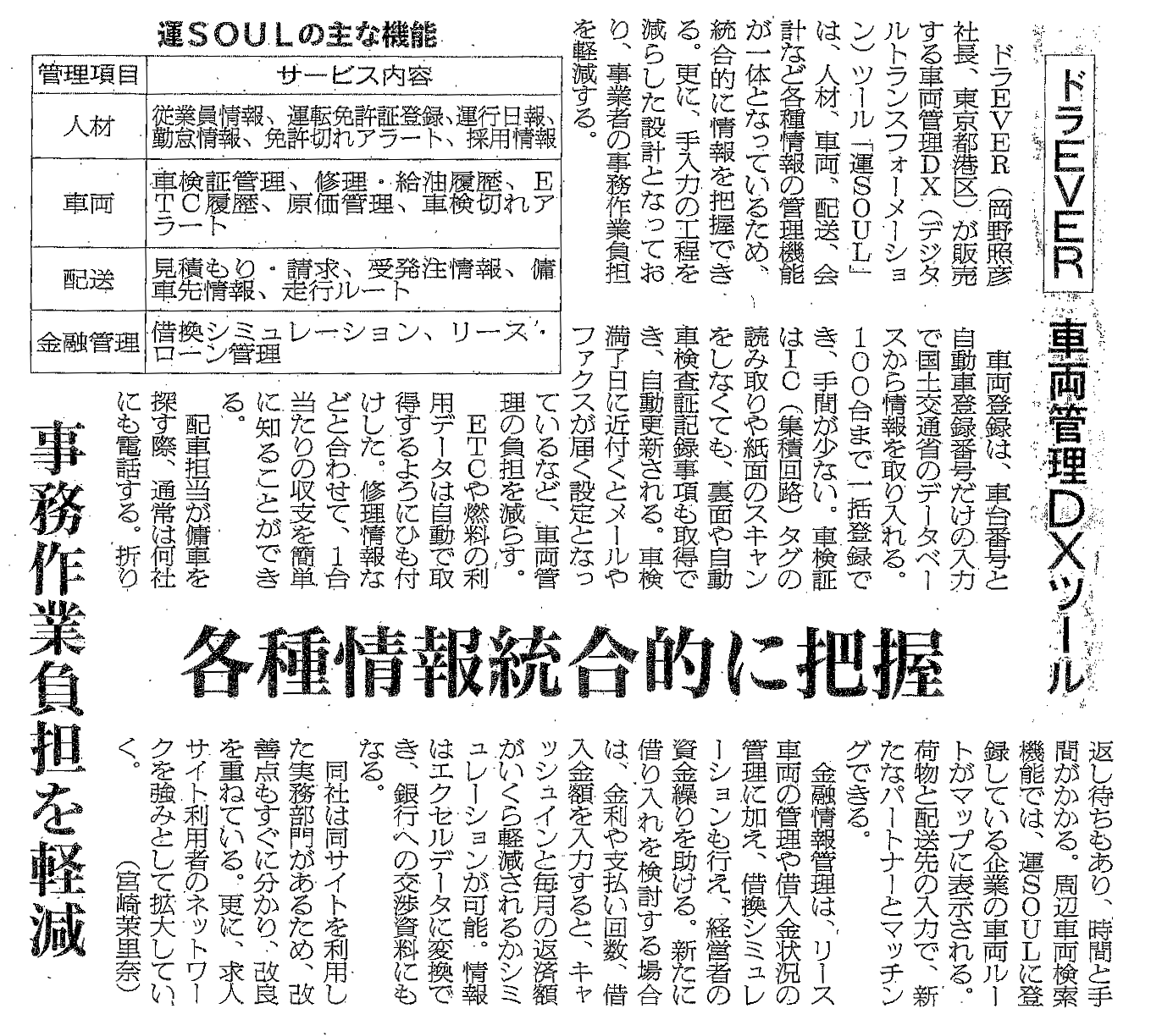 2025年1月3日発行の「物流ニッポン」に車輌管理DXツール「運SOUL」ついて記事が掲載されました ドラEVER ブログ NEWS 2025年1月3日発行の「物流ニッポン」に車輌管理DXツール「運SOUL」ついて記事が掲載されました Tweet 2025年1月3日発行の「物流ニッポン」に車輌管理DXツール「運SOUL」ついて記事が掲載されました。 投稿ナビゲーション 前の記事へ 次の記事へ
