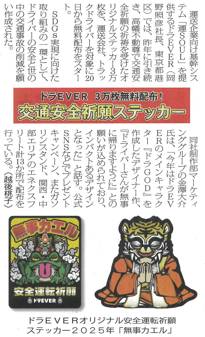 2025年1月23日発行の「物流ウィークリー」に安全祈願ステッカーの記事が掲載されました ドラEVER ブログ NEWS 2025年1月23日発行の「物流ウィークリー」に安全祈願ステッカーの記事が掲載されました Tweet 2025年1月23日発行の「物流ウィークリー」に安全祈願ステッカーの記事が掲載されました。 投稿ナビゲーション 前の記事へ 次の記事へ