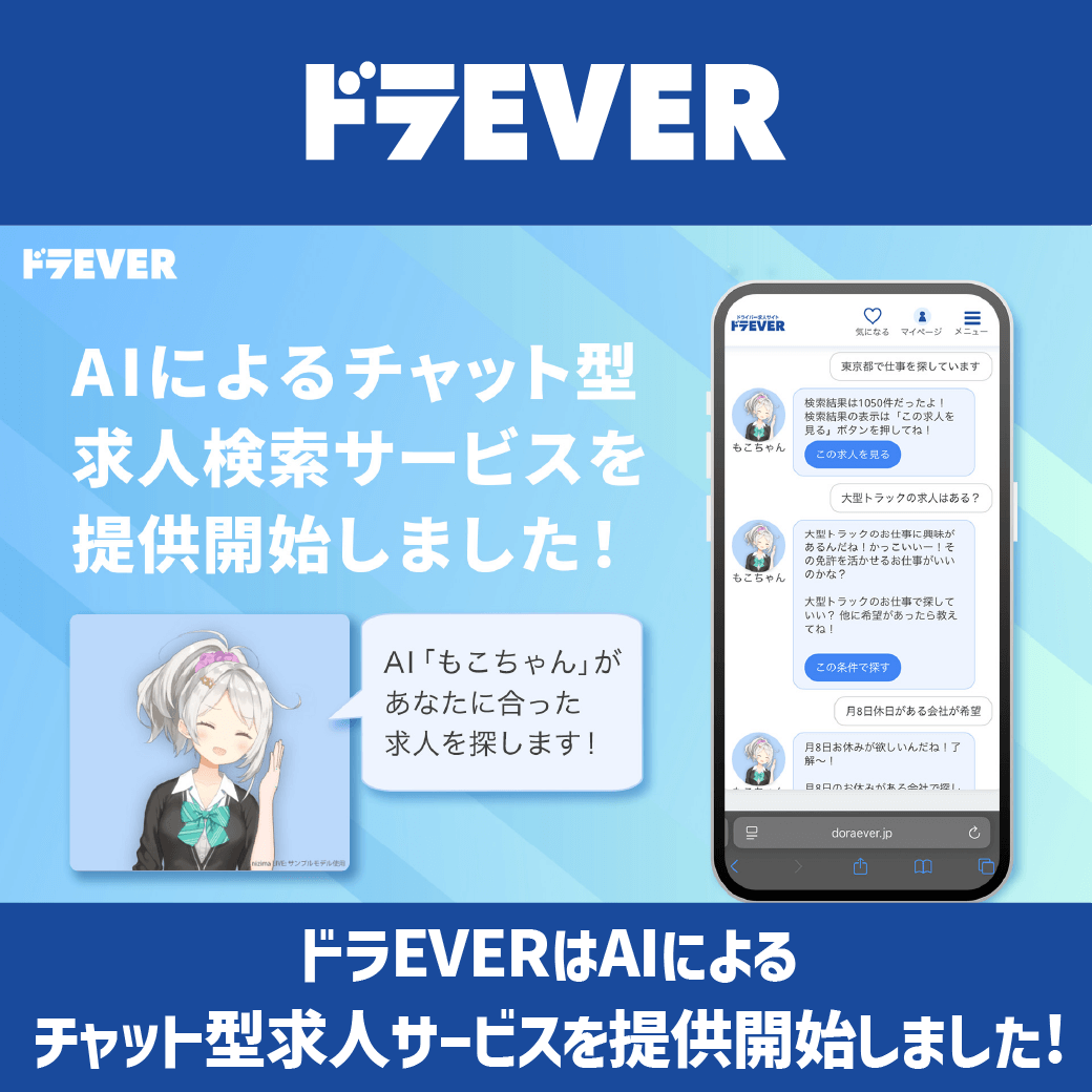 株式会社ドラEVERは、運送業界の仕事探しを全く新しい体験に変える、会員ユーザー様向けAIチャット型求人サービス「もこちゃん」の提供を開始いたしました。