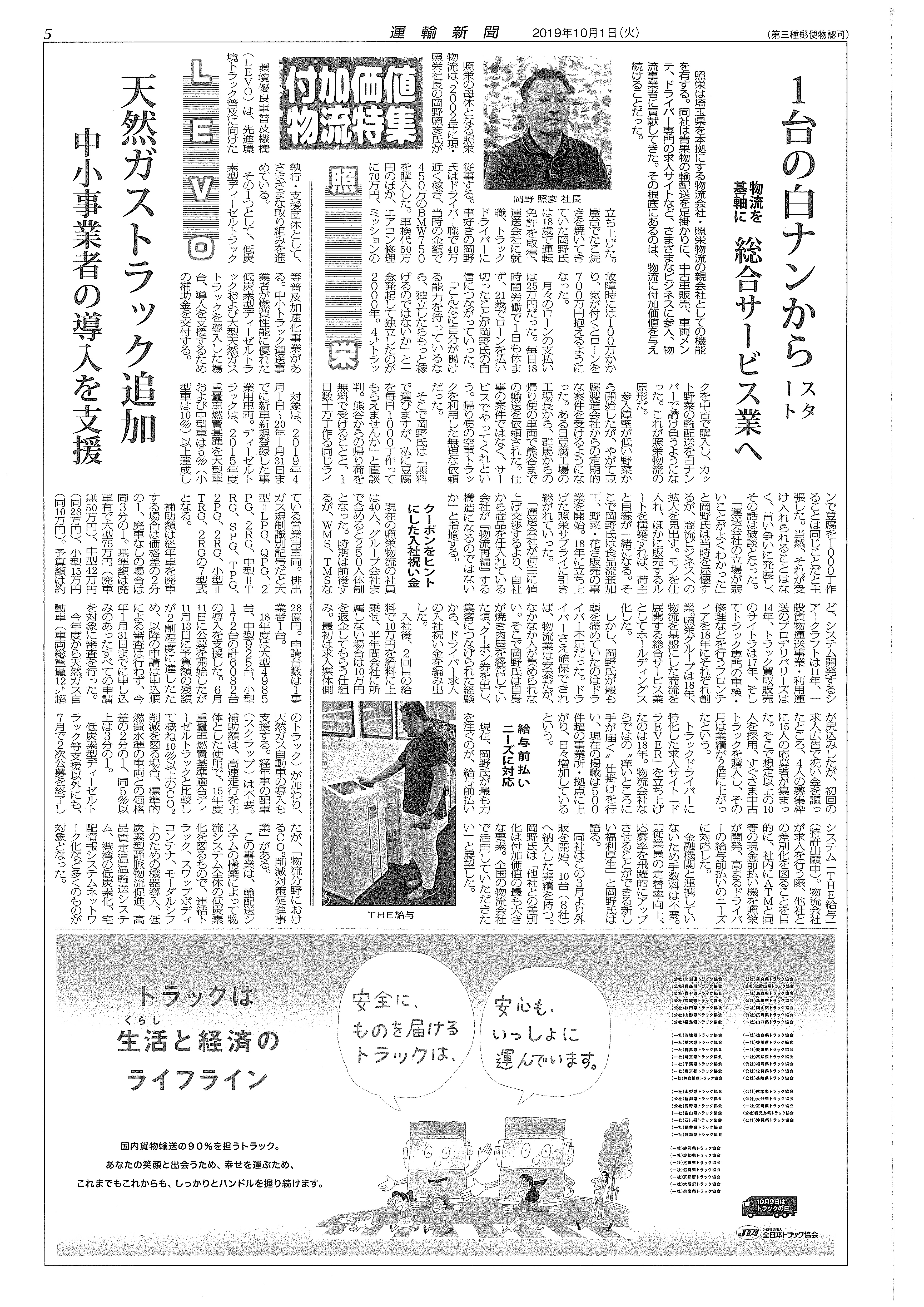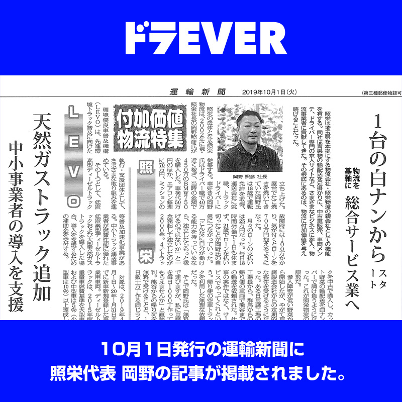 10月1日発行の「運輸新聞」に照栄代表 岡野の記事が掲載されました。 ドラEVER ブログ NEWS 10月1日発行の「運輸新聞」に照栄代表 岡野の記事が掲載されました。 Tweet 10月1日発行の「運輸新聞」に照栄代表 岡野の記事が掲載されました。 投稿ナビゲーション 前の記事へ 次の記事へ