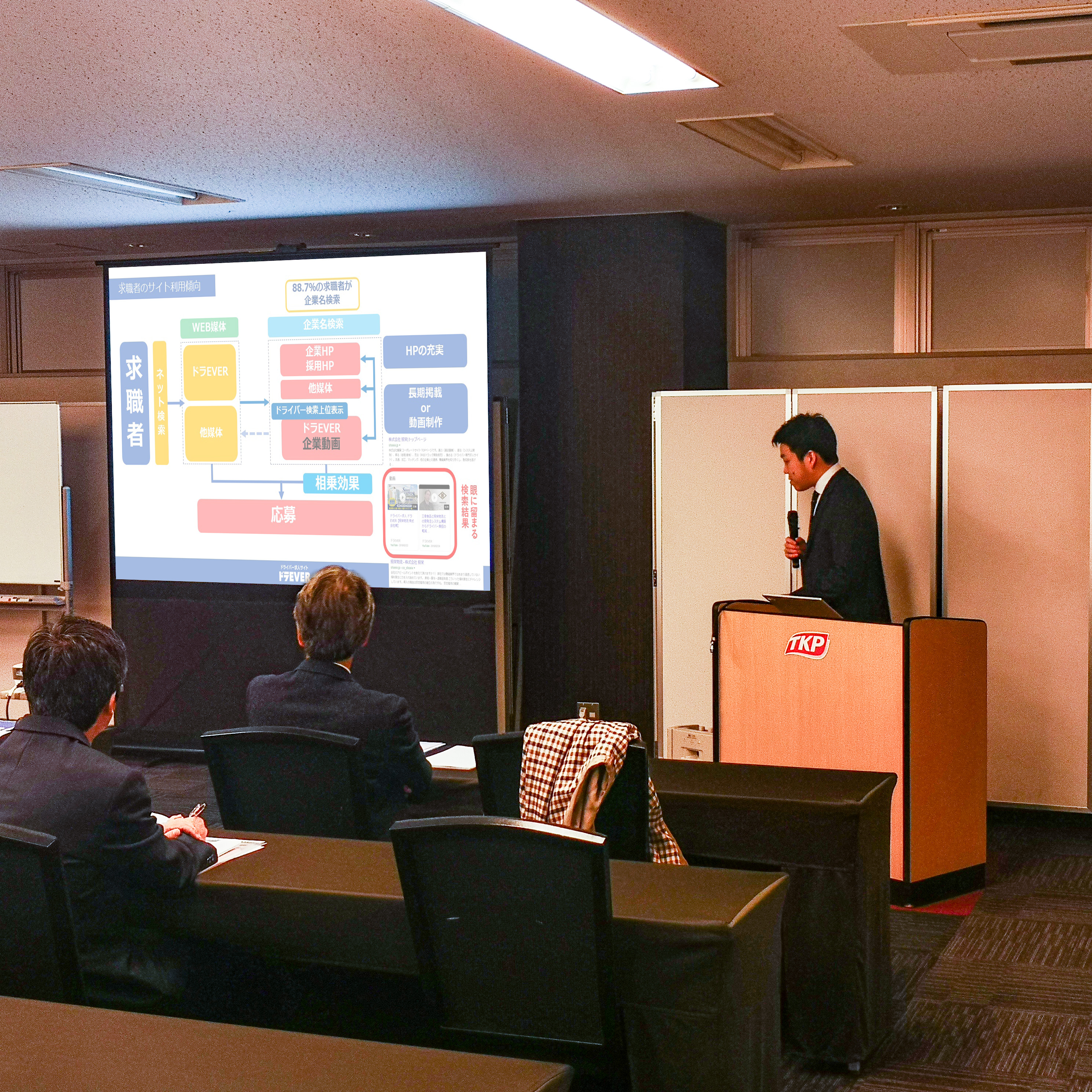 セミナーでは、船井総研ロジ株式会社 河内谷 庸高 氏と株式会社ドラEVER 代表取締役 社長 加藤 智江が登壇し、ドラEVER求人サイトの月間70万PV、15万人のユーザー情報から収集した情報をもとに、船井総研ロジが分析、様々な視点から今の人材確保に必要となる○○をご提案させていただきました。