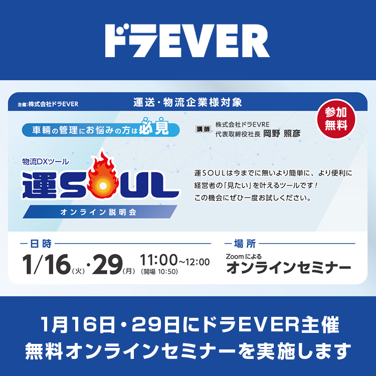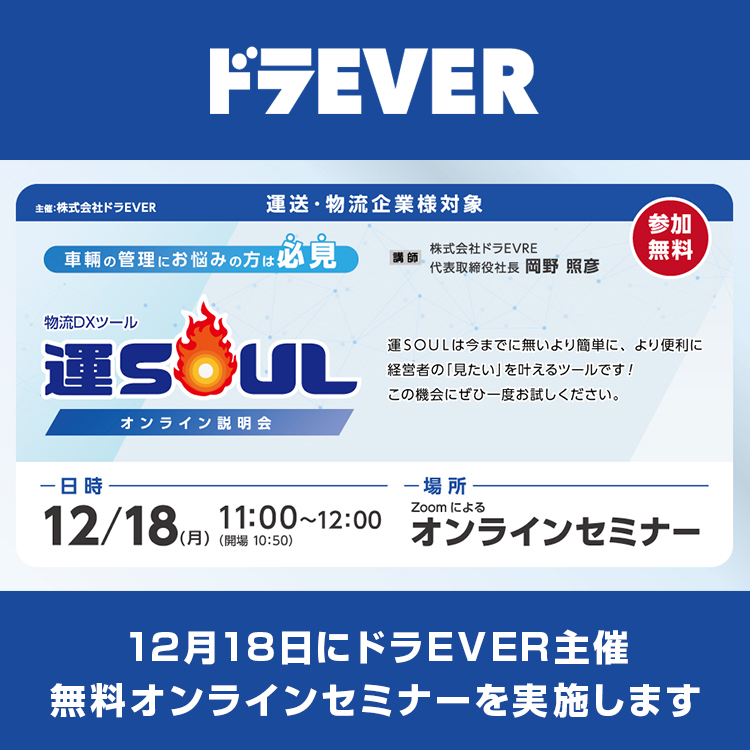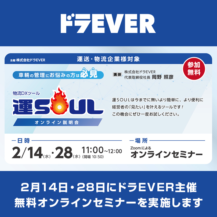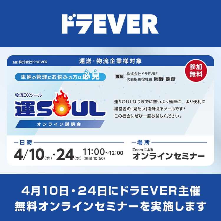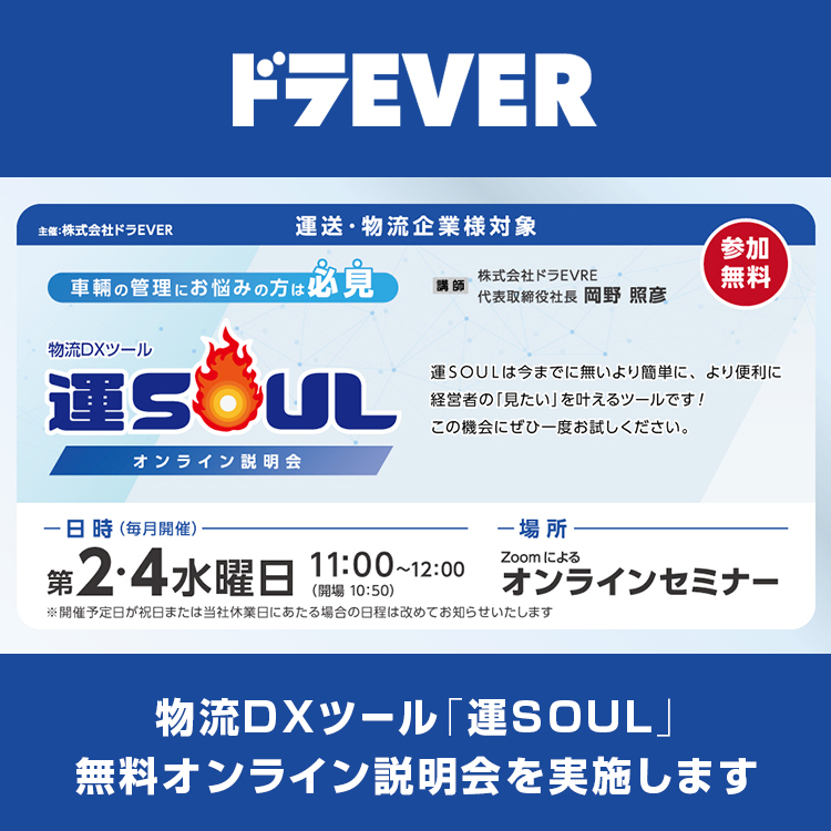 この度、毎度好評をいただいている弊社社長による『運SOUL オンライン説明会』を開催することになりました。 車輛管理に不安がある ...