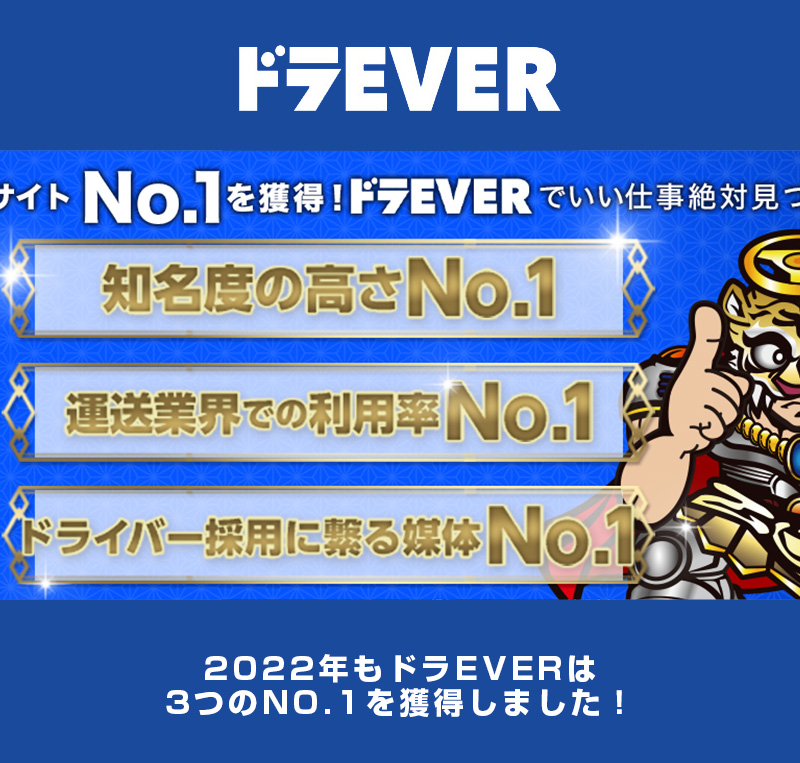 ドラEVERはおかげさまで 「知名度の高さNo.1」 「運送業界での利用率No.1」 「ドライバー採用に繋がる媒体No.1」 の3つ ...