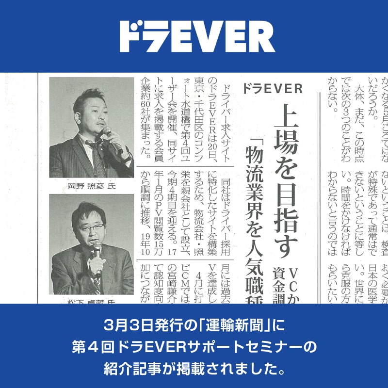 3月3日発行の「運輸新聞」に第4回ドラEVERサポートセミナーの紹介記事が掲載されました。