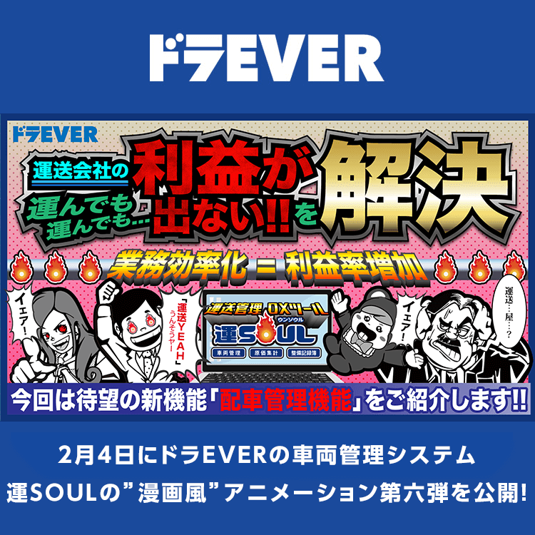 株式会社ドラEVER(本社:東京都港区 代表取締役:岡野照彦)は2025年2月4日(火)から車両管理システム「運SOUL」の”漫画風”アニメーション第六 ...