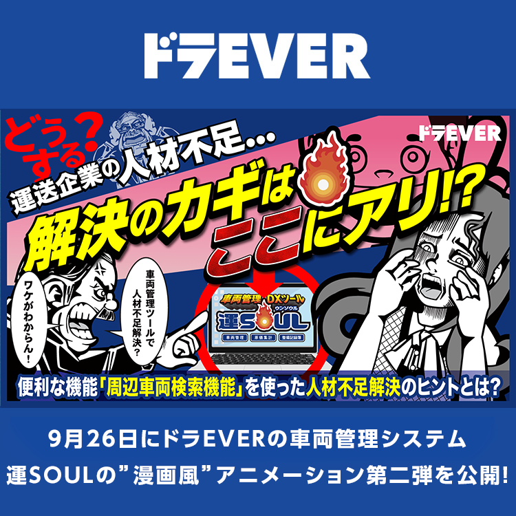 株式会社ドラEVER(本社:東京都港区 代表取締役:岡野照彦)は2024年9月26日(木)から車両管理システム「運SOUL」の”漫画風”アニメーション第 ...