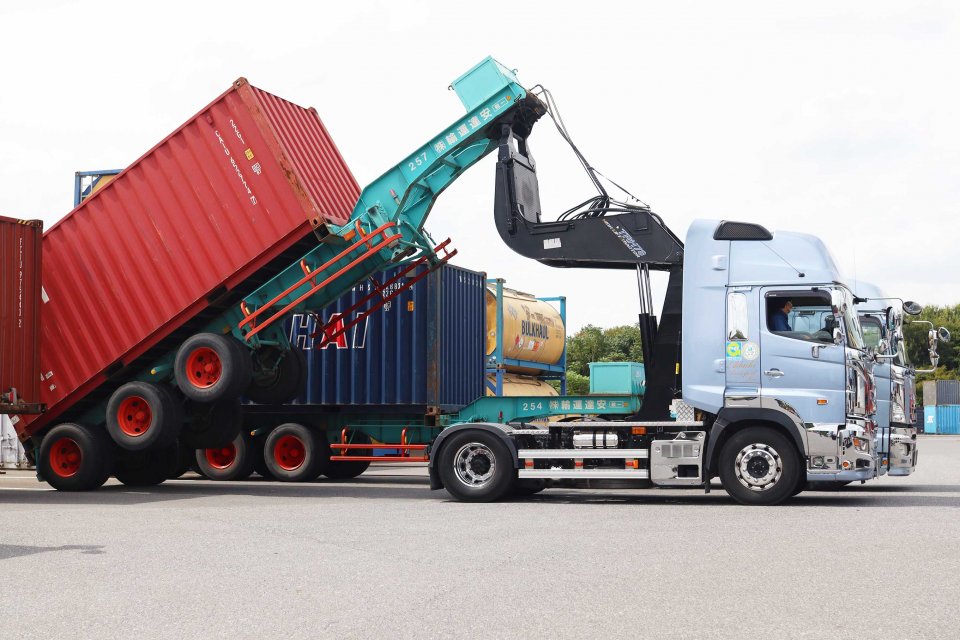 海上コンテナを内陸で載せ替え可能にすることで、多くの車両を使用することなく、 また運行距離を短くしてCO2排出量を削減し、「エコ物流」の実現に成功しました。