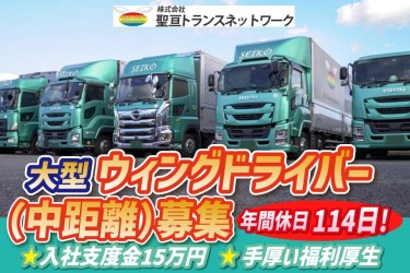 【中距離大型ドライバー(ウィング車)】愛知県や岐阜県など、関東圏との往復便、大手物流企業の専属便1運行で500km前後の2件積卸しの中距離輸送をお任せします。[配送物]ケース物やパレット物、ドラム、ロールなど[積み降ろし方法]フォークリフト自主荷役や手作業もあり、積載貨物や指示により調整します。[1運行の流れ(一例)]《1日目》出社~関東圏の積み地へ ↓中京圏に向け出発<車中泊>《2日目》出発~中京圏で2件荷卸し ↓中京圏の積み地へ、原則2件積み ↓関東圏に向け出発 ※稀に車中泊にて卸し地に直送する場合があります。 ↓帰社《3日目》出発~関東圏で2件荷卸しーーーここから次の運行ーーー関東圏の積み地へ ↓中京圏に向け出発<車中泊>多様なお仕事をご用意しています。詳細は面接時にご説明いたしますので、ご興味のある方はぜひお問い合わせください♪