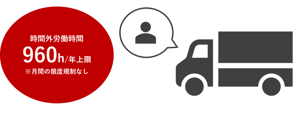 ドライバーは年間960時間を超えて時間外労働を行うことができなくなります。これは平均すると月80時間以内の時間外労働になるのですが、ドライバーに対しては月間の限度規制がなく、年間960時間以内の規制だけが適用されます。