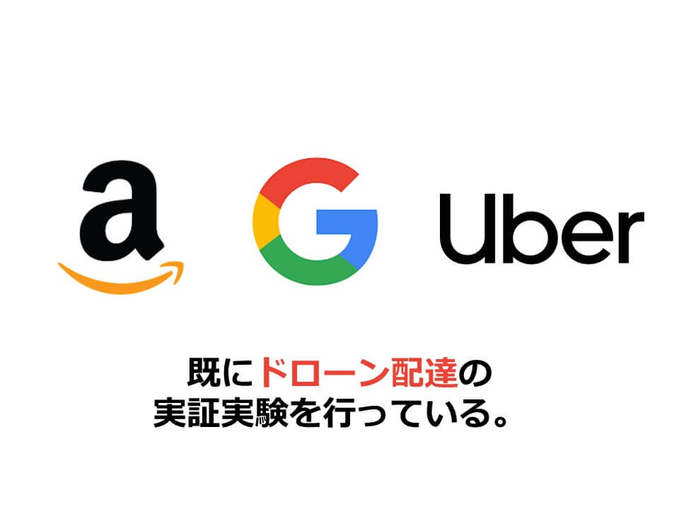 最初に本格的なドローン配達を提案し、実証実験を始めた事例としては2013年のアマゾンの取組が知られています。アマゾンはドローンを使ったプライムエアという商品配送サービスを開発し、アメリカやイギリス等で実証実験を行いました。その後、ウーバーがウーバーエアという同様のサービスを開発し、実証実験を行っています。またグーグルは子会社のウィングが実証実験を行っており、大手ドローン製造会社のDJIは様々な分野で実証実験を繰り返しています。