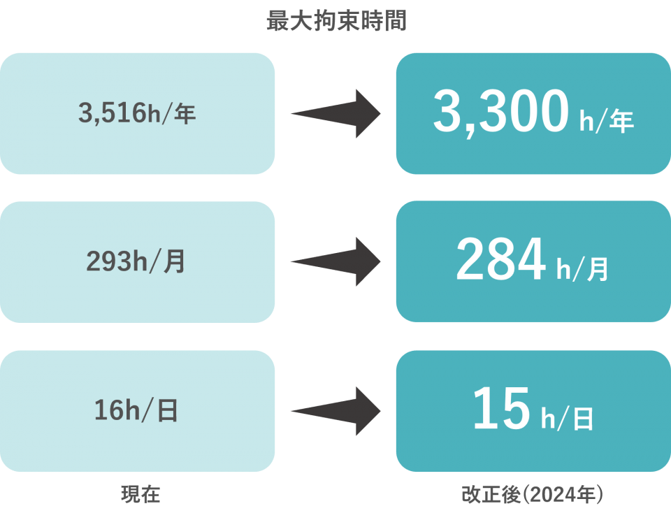 まず年間の最大拘束時間が3516時間以内から3300時間以内に大幅に短縮されました(但し、労使協定を締結している会社の場合は3400時間まで延長が可能)。