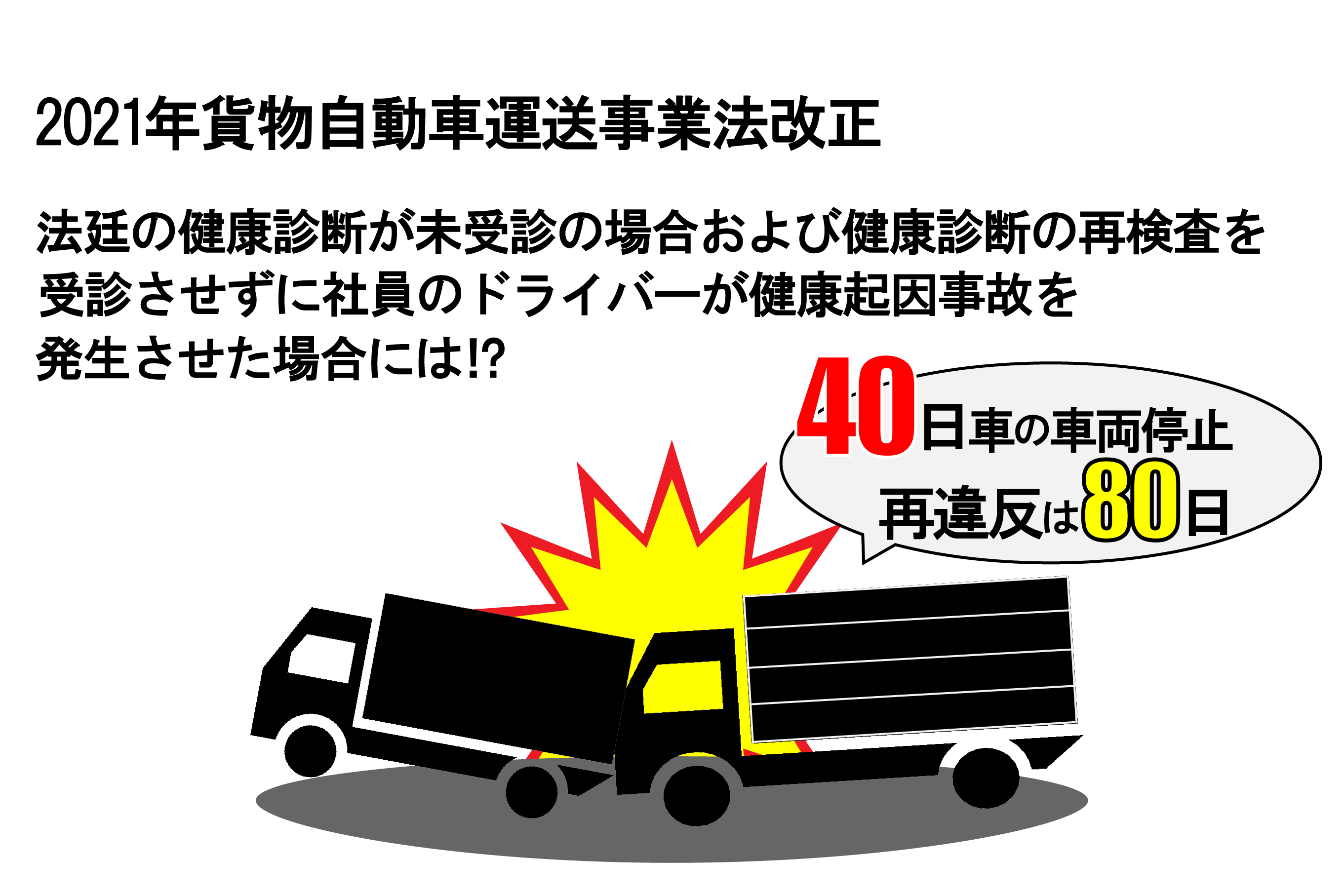 2021年の貨物自動車運送事業法改正により、法定の健康診断が未受診の場合および健康診断の再検査を受診させずに乗務させていた社員が健康起因事故を発生させた場合には、40日車の車両停止(再違反は80日車)とする行政処分の厳格化が行われました。