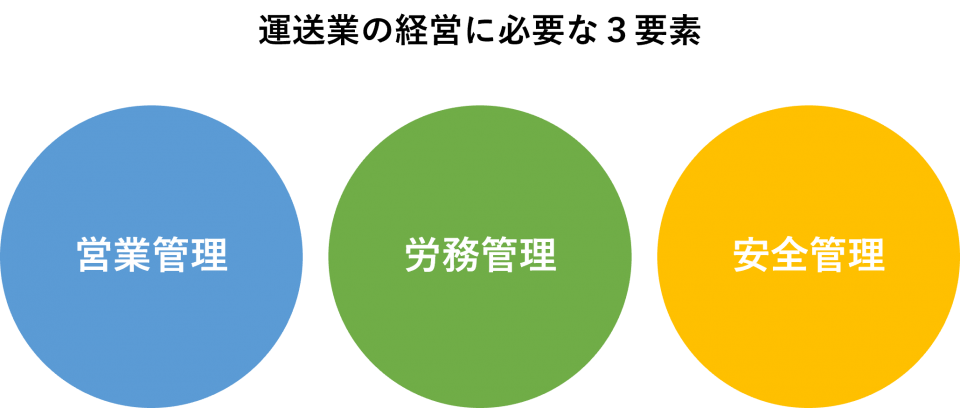 運送業の経営には最重要な3要素があります。その3要素とは「営業管理」と「労務管理」、および「安全管理」の3要素です。それらのどの要素を欠いても安定的な経営を維持することはできません。