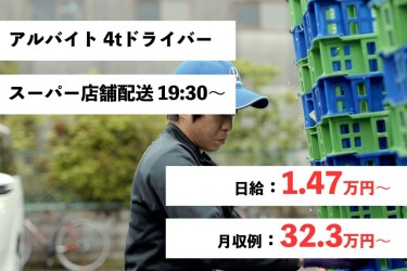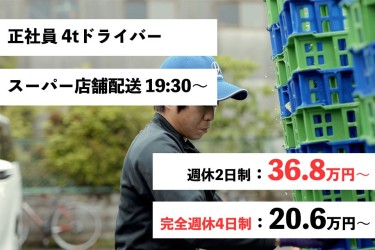 【正社員 4t 飲料・食品配送ドライバー / スーパー店舗配送/19:30~】
