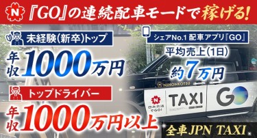 ➀テレビCMでお馴染みの配車アプリ「GO」を導入しています!1,800万ダウンロードの影響力は凄く、ひっきりなしに配車依頼が入ってくる状況です。仕事はたくさんありますのでご安心下さい!