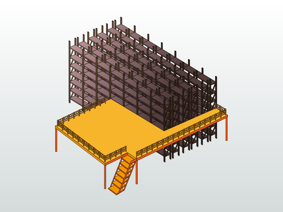 組み立て・解体が容易な中2階式の仮設棚。 フロアスペースを2倍から3倍へと増やし倉庫内の空間利用効率化を図れる。 積載ラックとも呼ばれる。