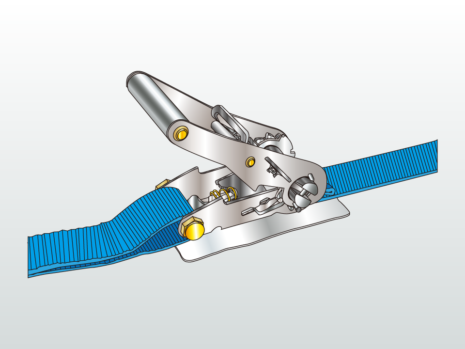 通称『ガッチャ』と呼ばれる、荷物の固定・締め付け用具。 荷室内に側面を取り付けたレールに引っ掛けることで使用する。 バックル固定のカム式とハンドルを反復させて締め付けるラチェット式。
